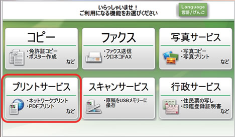 店舗のマルチコピー機で「プリントサービス」を選びます。